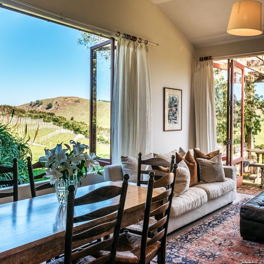 romantic vineyard hideaway overlooks the rolling valleys of Onetangi. Set beside award-winning wineries with views stretching toward the coast, this Mediterranean-style cottage is a private retreat for two.